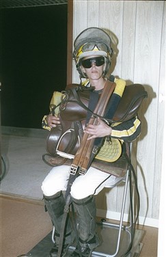 Sportchefen bestämde tid med ryttaren för fystestens springuppvisning, ryttaren infann sig på utsatt tid. Travbanan var helt mörklagd, fel årstid, inga strålkastare tändes. Flåsandet hördes i alla fall på bortre lång. Ryttaren klockade sig själv? sprang med blodsmak i mun för att klara tiden, trillade omkull, skrapade upp ett knä i mörkret, reste sig med blod rinnande och sprang i mål med klockan i hand. Jippie!