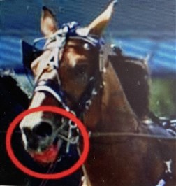 Starthäst kom i mål med näsblodet droppande, tränaren påstod att det berodde på ”ett stenskott” vilket det faktiskt kunde ha varit, grus-storlek på travbanorna varierar stort!