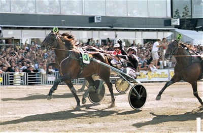 Hästen på bilden vann därför att både 1:an och 2:an i Elitloppets Final var dopade, segern tilldömdes då 3:an i mål, denna häst. (Ledtråd 2006)