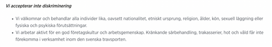 I Svensk Travsport instiftades Code of Conduct (Uppförandekod) som 2023 uppgraderats till sex (6) sidor och aldrig vad jag vet har redovisat resultat officiellt.